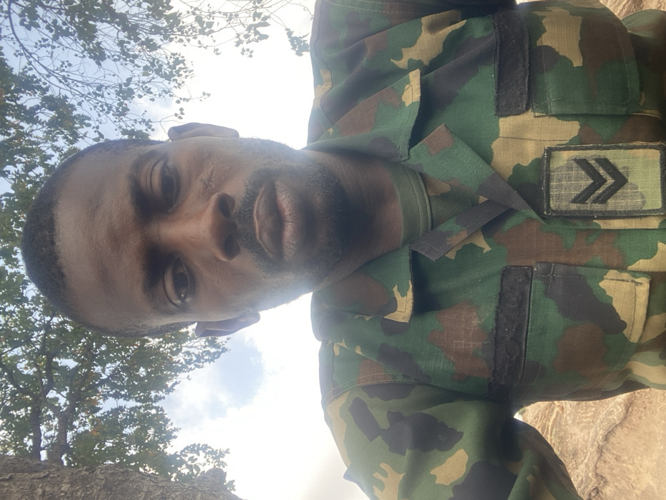 A close-up, low-angle portrait captures an adult male in an outdoor setting within Zaki Biyem, Nigeria. The individual has dark skin, short black hair, and stubble on his face. A distinct scar is visible on his right cheekbone. He is wearing a military-style camouflage uniform shirt, patterned in shades of green, brown, and black. The shirt features a collar, buttoned front, and two breast pockets. A black rectangular patch is located above the left breast pocket. On the right breast pocket, a rank insignia patch displays two downward-pointing black chevrons on a matching camouflage background. An olive green undershirt is visible at the neckline. The background reveals a partly cloudy sky, tree branches with green foliage on the left and right sides, and light-colored, possibly sandy or rocky ground in the lower portion.