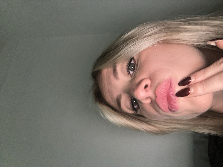A female individual is depicted in a close-up, low-angle shot, occupying the lower half of the frame against a uniform light grey background, indicative of an indoor setting in Le Cannet, France. The subject has blonde hair, parted centrally, framing her face. She has light-colored eyes, visible eyelashes, and defined eyebrows, with her gaze directed towards the camera. Her lips are pursed in a "kissing face" or "duck face" expression. The index and middle fingers of her left hand are positioned below her lower lip, with almond-shaped fingernails painted a dark burgundy color with lighter tips. A dark garment is partially visible on the left side of the frame. The lighting is soft and appears to originate from above or in front of the subject.