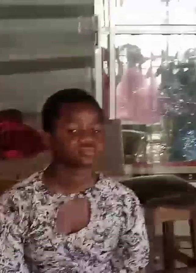A young woman sits indoors wearing a patterned grey and white shirt with a cutout near the neckline. She looks directly at the camera, appearing slightly annoyed or bored. In the background, there's a window with colorful objects and what seems to be a dress displayed. To the left, there's a red cloth draped over something, and a wooden stool is visible to the right of the woman. The camera slightly shifts during the video.