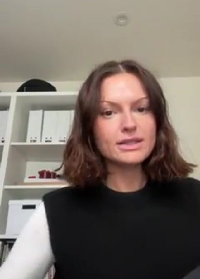 A young woman is centered in the frame, presenting her outfit to the camera. She has shoulder-length wavy brown hair, fair skin, and is wearing a white long-sleeved shirt underneath a sleeveless black sweater vest and dark denim jeans. She is crouching slightly, and her gaze is directed towards the camera. Behind her is a white bookshelf filled with books, white file boxes, and a black hat on the top shelf. The background is a plain off-white wall, and a flush mount light fixture is visible on the ceiling. The woman speaks directly to the camera, mentioning that she got dressed "properly" and then gesturing to her jeans.