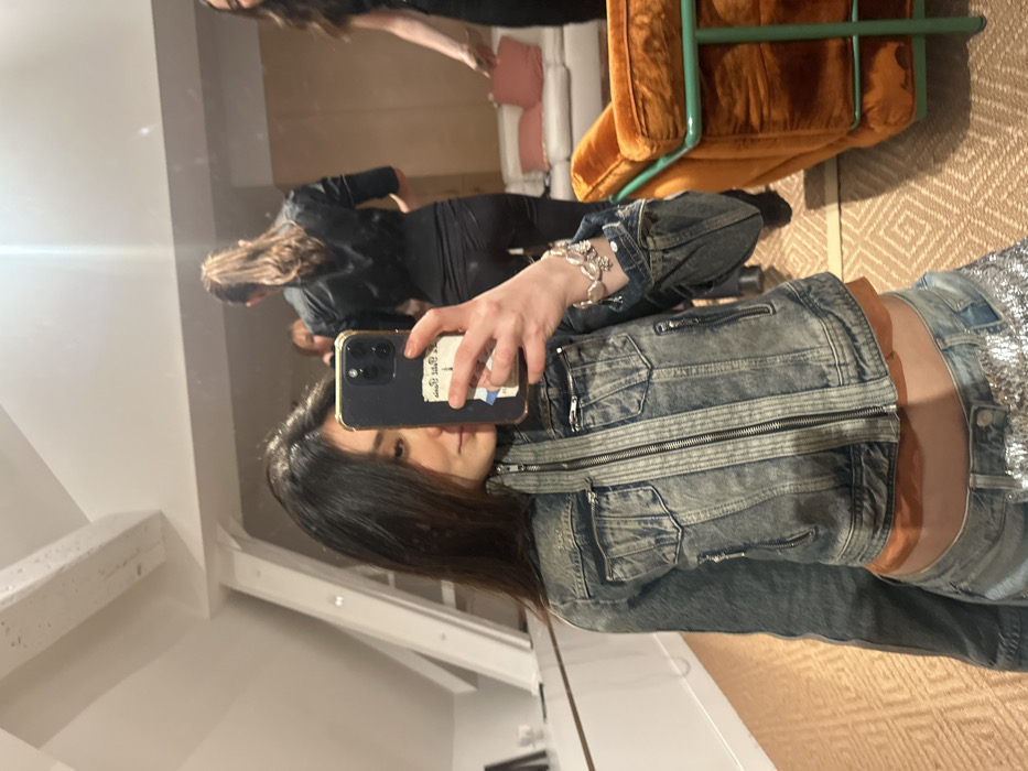 A young woman takes a selfie in a mirror. She wears a denim jacket and sparkly jeans with a tan undergarment or skirt visible at the waist. The reflection shows at least two other women, one in a black outfit, and part of an orange chair. The room appears to have white walls and a patterned rug. The phone case is dark with stickers or designs on it.