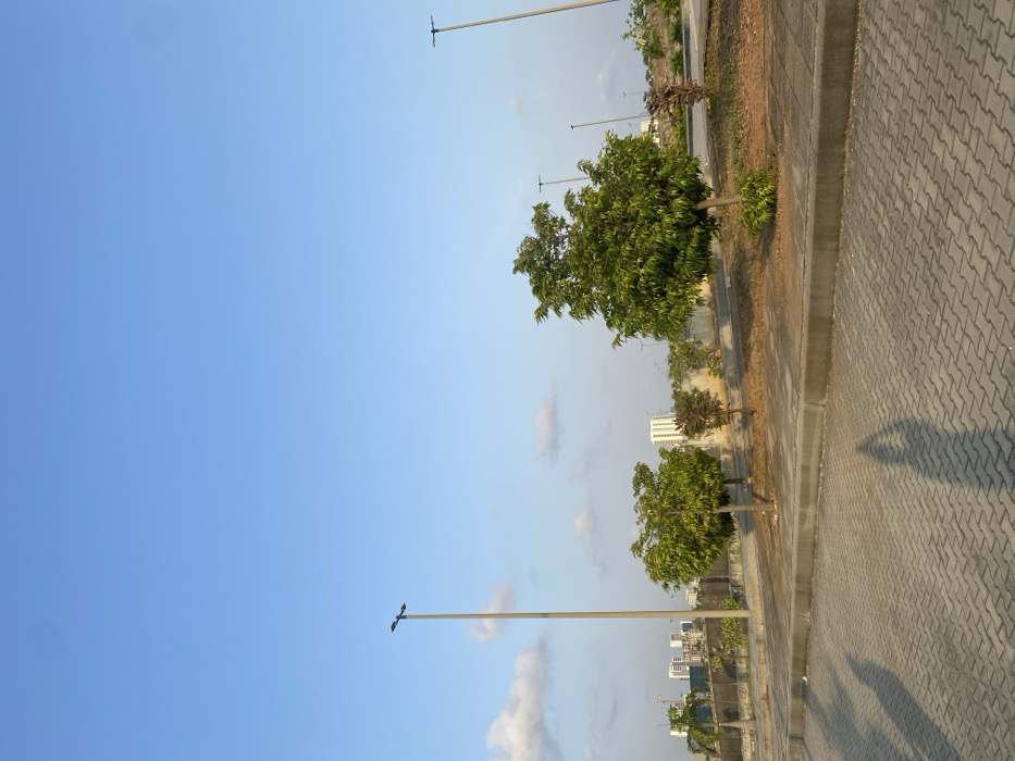A sidewalk with gray pavers runs along the right edge. It is bordered by a curb and a strip of land with trees and grass. A few lampposts are evenly spaced. In the background, several buildings are visible through the trees. The sky is blue with a few scattered clouds. A long shadow is cast on the sidewalk.