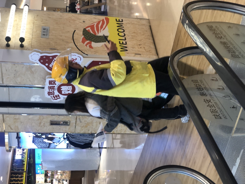 The image captures an indoor commercial environment within Yuzhong District, China, likely a shopping mall, featuring polished wooden flooring and bright overhead lighting. In the foreground, the upper section of an escalator is visible with black handrails and a clear safety instruction panel displaying text in both Chinese and English. Two individuals are walking from left to right across the frame. The individual in the immediate foreground is a male, distinguished by a bright yellow and dark grey uniform jacket, a yellow full-face helmet with a clear visor, and dark trousers. He holds a smartphone in his right hand and is observed looking down at its screen. Behind him and slightly to the left, a female subject with long dark hair is seen. She wears a white t-shirt, a grey patterned jacket draped over her shoulders, dark trousers, and white athletic shoes. A black backpack is carried on her left shoulder, and she holds a rolled document or magazine in her left hand, looking forward. To the right of the subjects, a wooden-textured wall displays a prominent "WELCOME" sign, a large graphic depicting sushi, and a smaller red cut-out sign with white Chinese characters and a stylized Christmas hat. Above these, a "FIRE HYDRANT" sign is affixed, printed in both English and Chinese. In the background, retail displays with various merchandise and reflective surfaces are visible, contributing to the commercial setting.