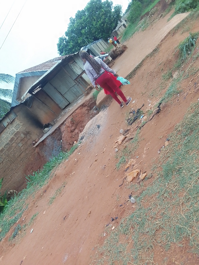 The image depicts a dirt road in what appears to be a rural or underdeveloped area. A woman wearing a checkered shirt and red pants is walking away from the camera. She is carrying a blue plastic bag. To the left is a dilapidated building with a corrugated metal roof. The surrounding landscape is uneven, with patches of grass and debris scattered on the ground. In the background, figures of other people can be seen. The image is taken at an angle. The city mentioned, Ukwu-Abwa, Nigeria, provides a location context.