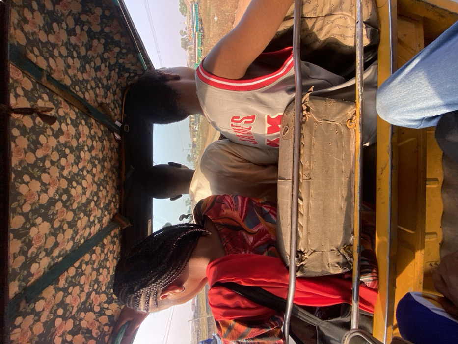 A group of individuals is riding in what appears to be a vehicle with a floral-patterned roof. One person wears a gray basketball jersey with red trim and lettering, the name “JAMES” visible. Another person sports braided hair and a bright red top with patterned fabric. Seating appears cramped, with minimal legroom. The vehicle’s interior is aged, with worn upholstery. Outside, the landscape is sun-drenched and appears to be a slightly developed area.