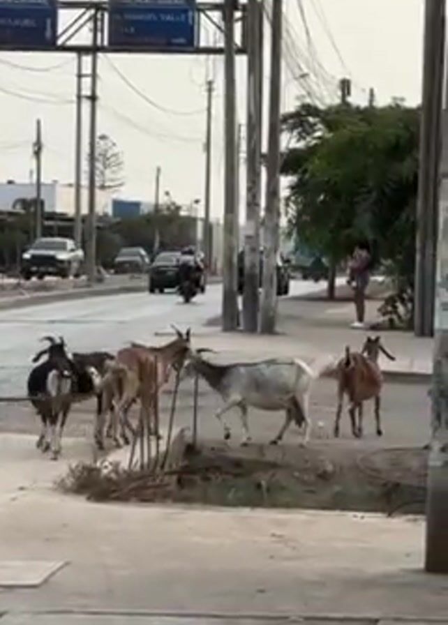 group of goats walking on a sidewalk in an urban setting. There are at least eight goats of varying colors and sizes. They are near a curb and a small patch of greenery. Behind the goats, there is a street with cars and motorcycles driving by. On the other side of the street, a person is standing with a child. Overhead, there are utility poles and wires, as well as a street sign indicating directions to "Pachacamac" and "Manuel Valle." The sky is overcast.
