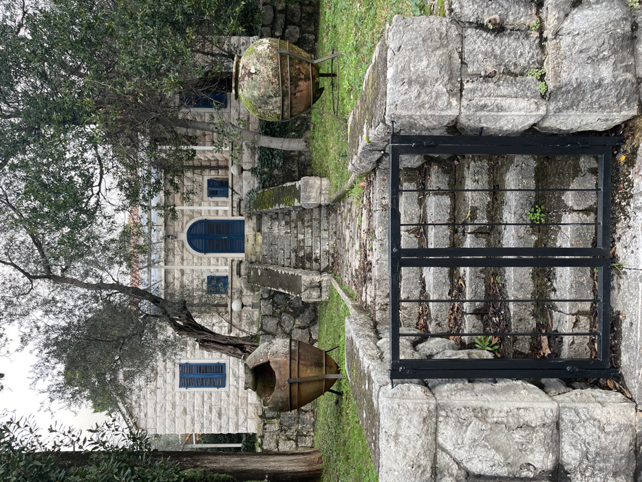 A stone building with blue shutters stands at the top of a set of stone stairs. The stairs are enclosed by stone walls and a black metal gate. Two large, round, antique pots flank the pathway. The pots are placed on metal stands. The scene is overcast and surrounded by greenery.