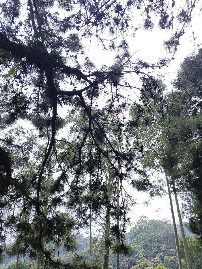 A close-up view gazes upwards through a dense network of pine branches laden with cones. The branches intertwine, creating a dark silhouette against a pale, overcast sky. Below, slender tree trunks ascend into the canopy, surrounded by lush green foliage covering the distant hills. The scene evokes a serene natural environment within a forest setting.