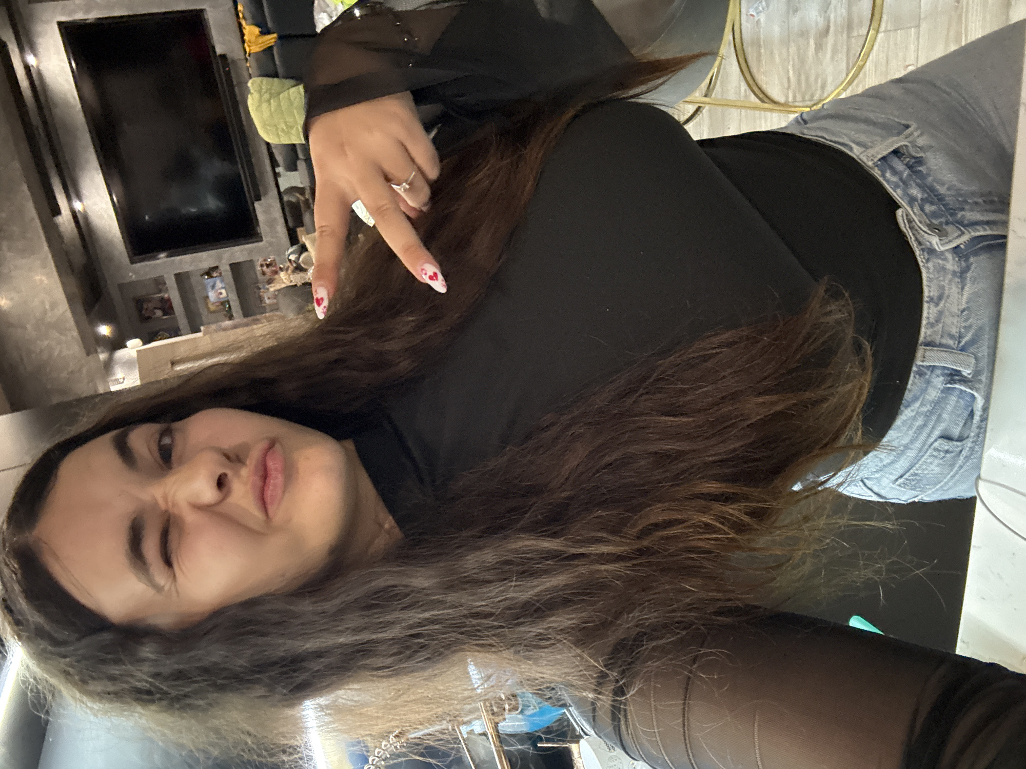 A young woman poses for a selfie. She is wearing a black long-sleeved top and light blue jeans. She is making a face with one eye squinted and her lips pursed. She is holding up her hand in a "peace" sign. Her nails are painted with small red hearts. She is wearing a ring. The background shows a living room with a television and shelving. This scene cannot be identified as specifically occurring in Banya, Bulgaria without additional information.