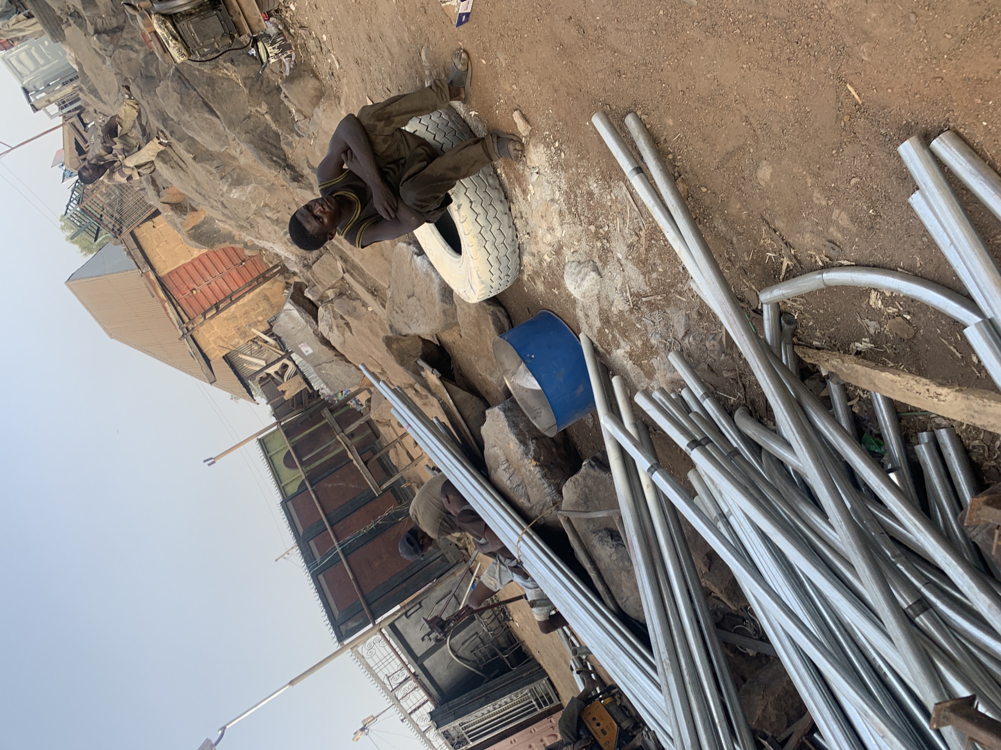 The scene depicts an open area in what appears to be an industrial or construction zone within the city of Barakin Akawo, Nigeria. One man is resting, leaning against a tire on a rocky section of the ground, while another man is visible working with tools near a stack of long metal pipes. A blue container rests near a pile of rocks. The surrounding environment includes buildings of varied construction materials, a gate with spikes on top, and a clear sky.