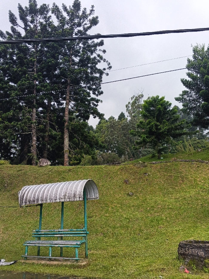 A covered bench sits on a grassy slope with tall trees in the background. Power lines cross the sky above the trees. A small sign labeled "Bak Sampah" is visible in the lower right corner. The scene appears to be a park or natural area, possibly on a cloudy day.