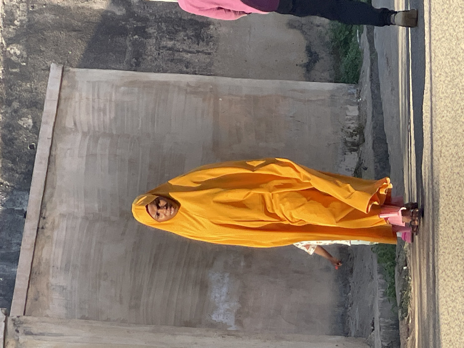 The image captures a daytime street scene in Jos, Nigeria. Central to the frame, an adult female figure walks towards the viewer, slightly oriented to the left. She is fully clad in a bright yellow, floor-length garment that covers her head and body, with her face visible, displaying a neutral expression. She wears brown sandals, and pink trousers are visible beneath the yellow garment. Behind and to the left of this woman, a small child is partially visible, extending their right arm forward. The child wears a white patterned top, light-colored trousers, and pink footwear, holding a red, spherical object in their right hand, possibly a lollipop. On the far right, a third individual is partially captured, facing away or sideways from the viewer, moving to the right. This person wears a pink long-sleeved top, dark trousers, and light-colored shoes. The background consists of a light-colored, textured wall extending horizontally across the mid-ground, topped by a darker, rougher wall. Both walls show signs of weathering and discoloration. Sparse green vegetation is visible at the base of the darker wall on the right. The ground is a paved surface, likely asphalt, exhibiting distinct shadows cast by the figures, indicative of direct sunlight from the right.