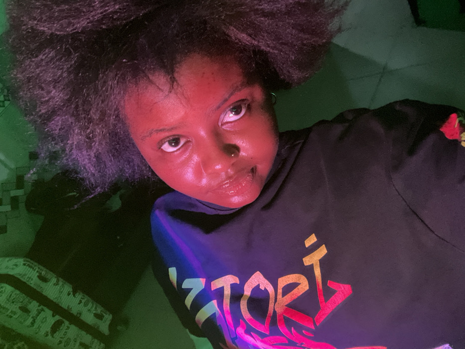 A person gazes upward with wide eyes, a subtle lip quirk suggesting a faint smile. Their hair is voluminous and dark, appearing somewhat frizzy. A nose ring adorns their left nostril. The individual wears a black t-shirt featuring a vibrant, colorful design, possibly lettering. A green-toned light casts a striking glow on the scene, enhancing the person's complexion with a reddish hue and creating contrasting shadows.