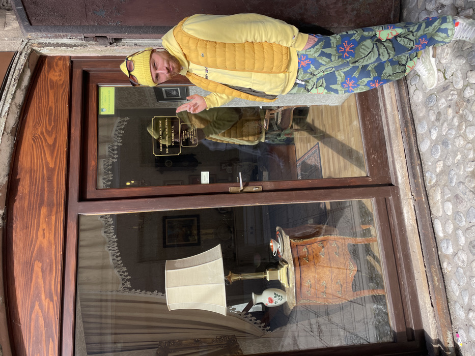 The image captures an adult male posing in front of a glass storefront at Radićeva 5, Sarajevo, Bosnia and Herzegovina, identified by a sign on the door as "AGENCIJA ZA NEKRETNINE ZOR – GALERIJA NEKRETNINA." The man, with a reddish-brown beard, wears a yellow knitted beanie with yellow sunglasses, a yellow hooded sweatshirt with a small logo, a yellow puffer vest, and blue and green pixelated patterned sweatpants. He stands on a cobblestone surface, facing forward with a slight smirk. His right hand is raised, forming a "peace" or "victory" sign, while his left hand is in his pocket. The storefront consists of a dark wooden frame with an arched top, enclosing a large display window and a glass door with a visible handle. A yellow-green sticker is affixed to the upper left of the glass door. The interior, visible through the glass, features an antique-style setup. In the display window, a small ornate wooden chest of drawers with a light-colored top holds a white vase with a red floral pattern, a brass table lamp with a light-colored rectangular shade, and a small teacup and saucer. A lace-trimmed curtain is visible along the top interior edge of the window. Reflections of the man and the surrounding exterior environment are visible on the glass. Bright sunlight illuminates the scene, creating distinct shadows.