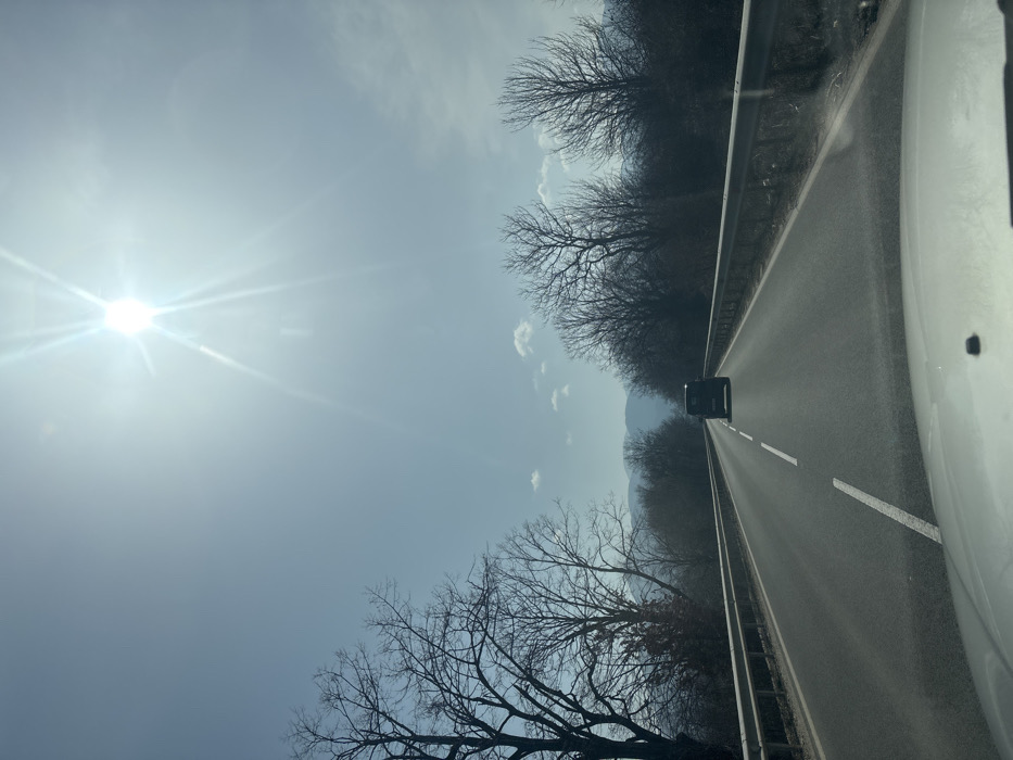 The image depicts a straight asphalt road, likely situated near Topolovo, Bulgaria, as viewed from the interior of a vehicle. The road features a solid white line on the left edge and a dashed white line indicating the center, separating two lanes. Metal guardrails line both sides of the road. Ahead, a dark-colored van or SUV is visible, traveling in the same direction. The surrounding environment consists of numerous deciduous trees, currently bare of leaves, suggesting a late winter or early spring season. In the distance, mountains are visible under a clear, bright blue sky with sparse white clouds. The sun is positioned high in the sky, creating a strong glare and lens flare in the upper right quadrant of the image. No individuals are discernible.