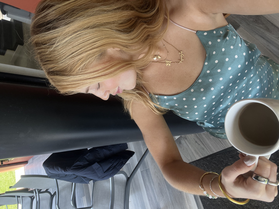A woman in a teal and white polka dot dress sits at a table, holding a white mug with a beverage. She wears a gold necklace and several bracelets on her left wrist. A black jacket is on a chair next to the table. The flooring is light gray. Outdoor greenery is visible through a door. The woman has blond hair and her eyes are closed.
