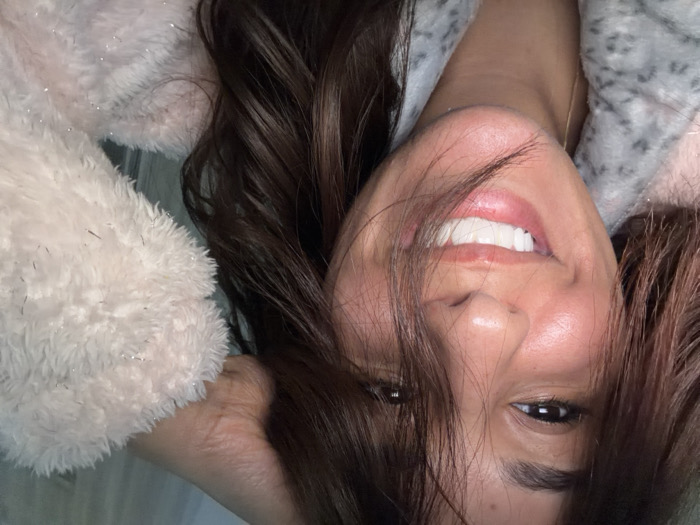 A woman is smiling, her head upside down, hair partially covering her face. Her teeth are white and visible in her smile. She appears to be lying down, with a fluffy, light-colored blanket or jacket near her head. The lighting is soft and diffused. She is wearing a grey patterned top. Her expression is cheerful and inviting.