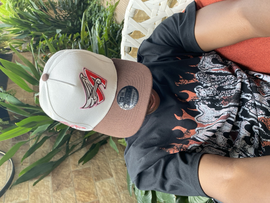 An individual is depicted from the chest up, seated in what appears to be an outdoor or semi-outdoor setting in Moba, Nigeria. The person's face is obscured by the downward-tilted brim of a two-tone baseball cap. The cap features an off-white crown and a brown brim with a white "NEW ERA 9FORTY ADJUSTABLE" sticker. An embroidered logo on the cap's front displays a stylized red letter "A" flanked by white or light gray wings, outlined in red. The individual wears a black short-sleeved t-shirt adorned with an orange flame motif transitioning into distressed white and black patterns across the chest. A portion of a white wicker or rattan chair is visible to the right, adjacent to an orange cushion or armrest. The background consists of vibrant green broad-leafed plants in front of a light brown tiled or stone wall.