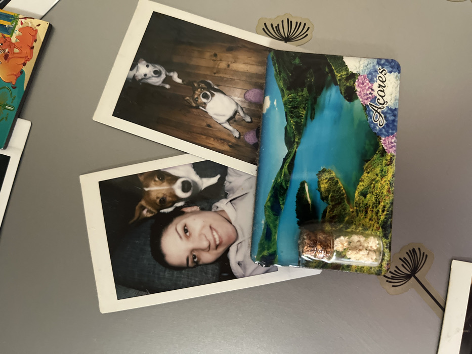 The scene depicts a collection of items attached to a gray, metallic surface, identified as a refrigerator door in Lom, Bulgaria. Two instant-style photographs, framed with white borders, are prominently displayed. The left photograph features a smiling female with dark hair, visible from the chest up, positioned alongside a brown and white dog with pointed ears, both looking towards the viewer. The right photograph shows two small dogs, one predominantly white and the other brown and white, both looking upwards on a wooden floor. Below the lower dog, a pair of purple slippers is partially visible. Overlapping these photos at the bottom is a rectangular magnet showcasing an aerial landscape with a vibrant blue body of water surrounded by lush green hills. The word "Açores" is inscribed in white text on a floral design in the lower right corner of this magnet. A small clear glass bottle with a cork stopper, containing numerous tiny white or light pink dried flowers, is affixed to the left side of the landscape magnet. Additional magnets are partially visible: a colorful rectangular magnet with cartoon camels at the top center, and two black and white fan-shaped or dandelion seed head magnets positioned on the lower left and lower right sections of the refrigerator door. A small, indistinct green object is visible at the very top edge.