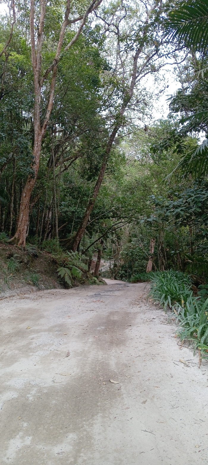 The image displays an unpaved dirt path winding through a dense, lush forest in Colonia Tovar, Venezuela. The path, light gray-brown with localized darker, damp areas and scattered leaf debris, occupies the lower and central foreground, receding into the background with a gentle curve to the left. An earthen bank on the left side of the path is covered with ferns and smaller green foliage. The right side is bordered by a distinct cluster of long-leafed green plants. The entire scene is enveloped by a thick, multi-layered forest canopy, presenting numerous trees of varying trunk diameters and bark textures, all adorned with abundant green foliage. Diffused light from an overcast or heavily filtered sky is visible through breaks in the overhead canopy. No individuals, animals, or man-made structures are present within the frame.