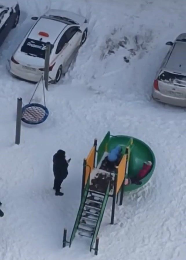 A high-angle, static shot depicts a snow-covered playground and parking area. The ground is blanketed in thick snow. In the foreground, a children's slide with a green bowl-shaped bottom is visible. Two figures, presumably children, are inside the slide. One is lying face-up, while the other appears to be sitting. Next to the slide, a person dressed in black is standing and looking at a mobile phone. To the left of this individual, another person wearing a red hat and a dark coat is walking. Behind the playground equipment, three cars are parked, each dusted with snow. One car is white and seems to have a taxi roof sign. A round swing hangs suspended in the background, adding to the playground setting. The overall atmosphere suggests a cold winter day.