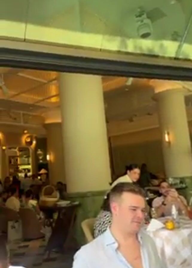 The video appears to be shot from a restaurant or cafe, looking out through a large sliding glass door