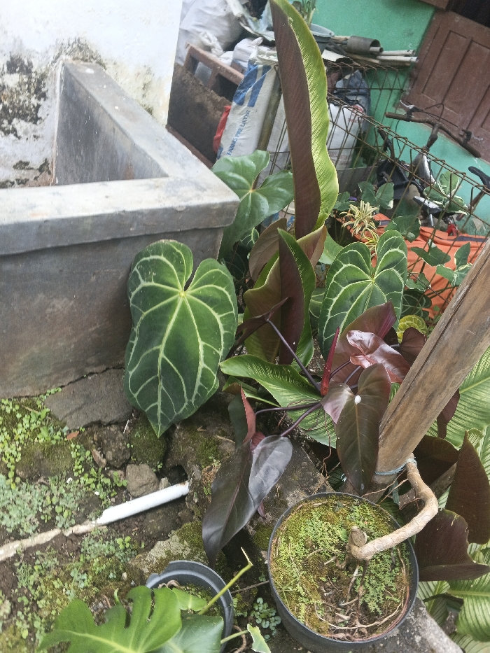 The image displays an outdoor area in Bien Hoa, Vietnam, characterized by dense vegetation and functional elements. In the left foreground, a weathered, gray concrete basin abuts a light-colored wall exhibiting stains. A single large, dark green, heart-shaped leaf with prominent light green veins rests against the base of the concrete structure. The immediate ground consists of uneven soil covered with moss and small green plants, traversed horizontally by a section of white PVC pipe. The midground is dominated by various tropical plants, including several with reddish-brown leaves, a tall emerging leaf stalk or spathe displaying a red and green gradient, and other green foliage, some with striped patterns. A rough, vertical wooden post or branch supports some plants on the right. Two black plastic plant pots are visible in the lower right; one contains mossy ground cover and a gnarled, bare branch, while the other holds a large green leaf. The background, behind the plants, reveals a cluttered area comprising white sacks, one with partial blue printing, wooden frames, and metal components consistent with bicycle parts. A green surface is partially visible behind the clutter. No individuals are present in the scene.