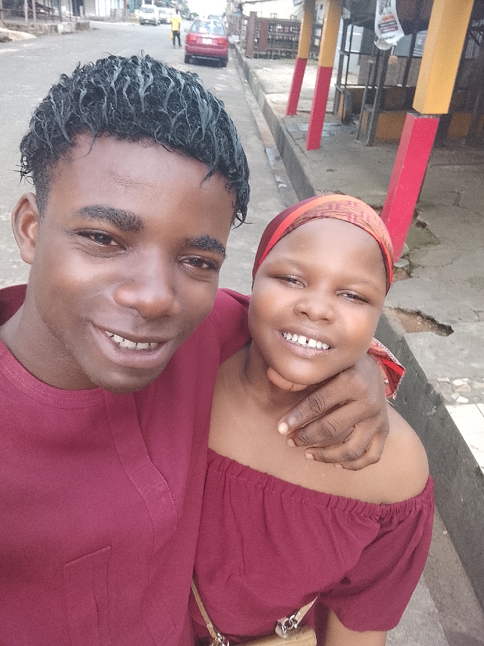 A selfie features a young couple smiling brightly. The man, on the left, wears a maroon shirt. His hand rests on the woman's shoulder. The woman, with a patterned headscarf, dons a matching off-the-shoulder top. A street serves as the backdrop, with cars and pedestrians visible in the distance. Red and yellow painted pillars line the sidewalk.