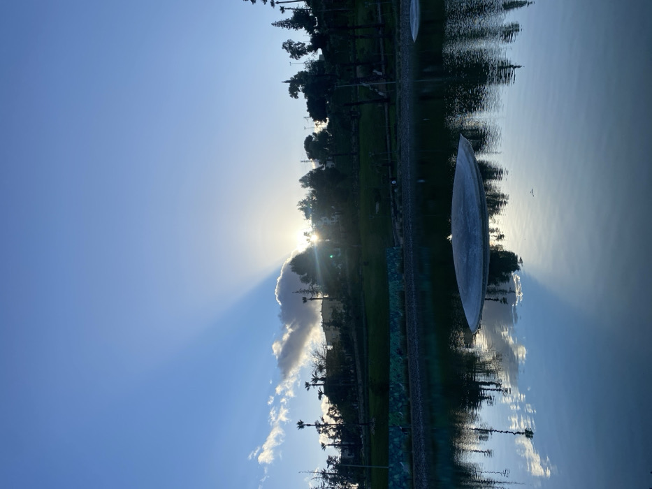 A bright sun bursts through a cloud near the horizon, casting rays against a blue sky. Below, a body of water reflects the sky, clouds, and surrounding greenery. Trees line the edge of the water, and a large, oval sculpture stands partly submerged, its reflection visible in the water. The image is oriented vertically.