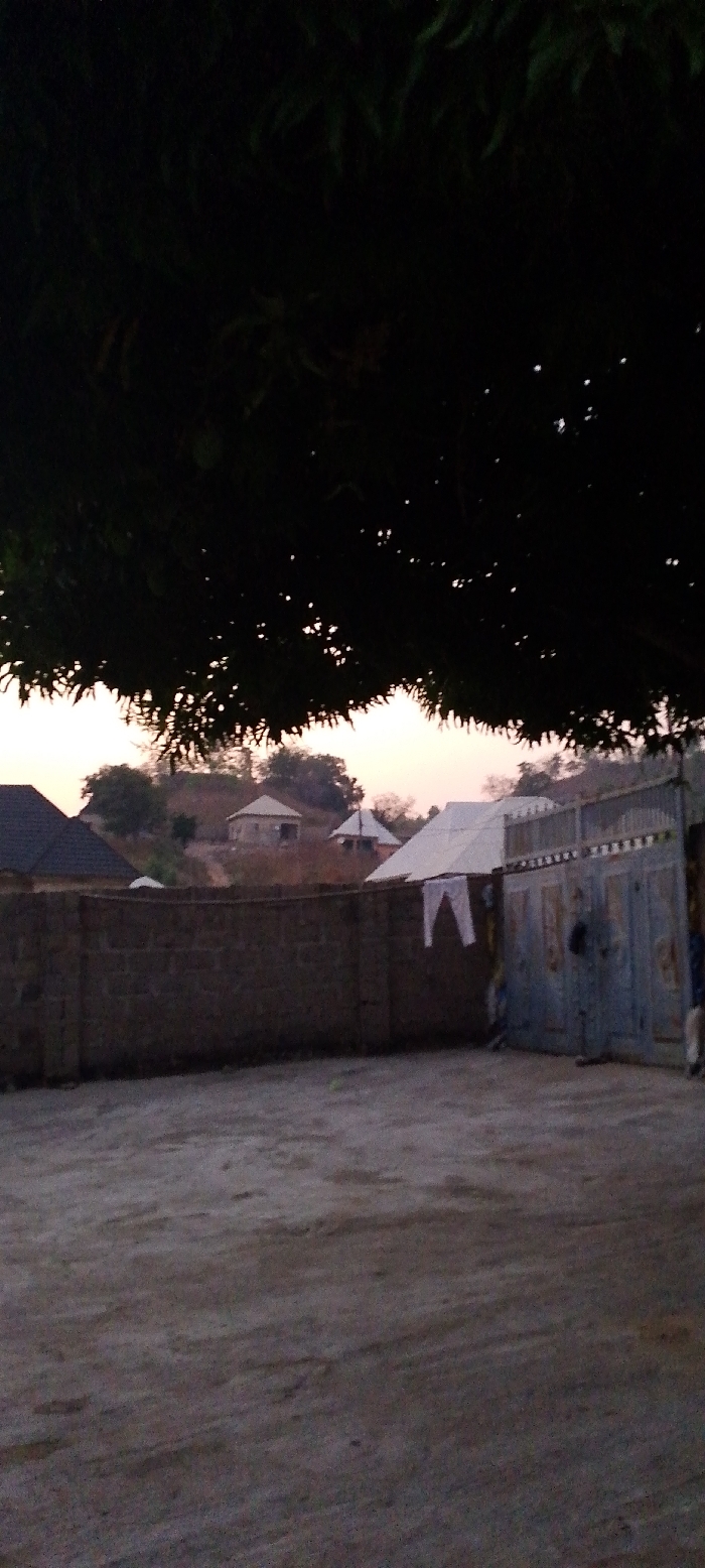 A low-angle shot depicts a courtyard setting beneath dark foliage. A stone wall stands as a barrier, with a gate visible to the right, adorned with hanging white cloth. Beyond the wall, a cluster of houses appears on a distant hill, silhouetted against a soft, dawn-like sky. The courtyard surface dominates the foreground, its texture catching the dim light. The scene evokes a sense of stillness and rural tranquility.