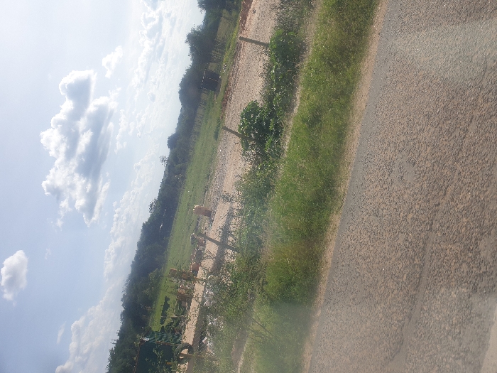The image depicts a rural or semi-urban landscape in Kinanie ward, Kenya, captured from a slightly elevated perspective. In the immediate foreground, the surface of an asphalt road, textured with dark aggregate, occupies the lower portion of the frame. Directly above the road, a strip of green grass and unkempt vegetation borders a lighter-colored dirt or gravel path. Along this path, several rudimentary wooden fence posts are visible. To the left, a structure or object covered with a green tarp is partially obscured, accompanied by what appears to be discarded tires. Further right on the dirt path, two light-colored sacks, potentially containing goods or materials, stand upright. In the mid-ground, a broad expanse of green field stretches towards a distant tree line. A small, dark, rectangular structure, possibly a kiosk or shelter, is discernible amidst vegetation on the right side of the field. The background consists of dense green foliage and trees under a bright blue sky with scattered white cumulus clouds, suggesting clear daytime conditions. No individuals are visible.