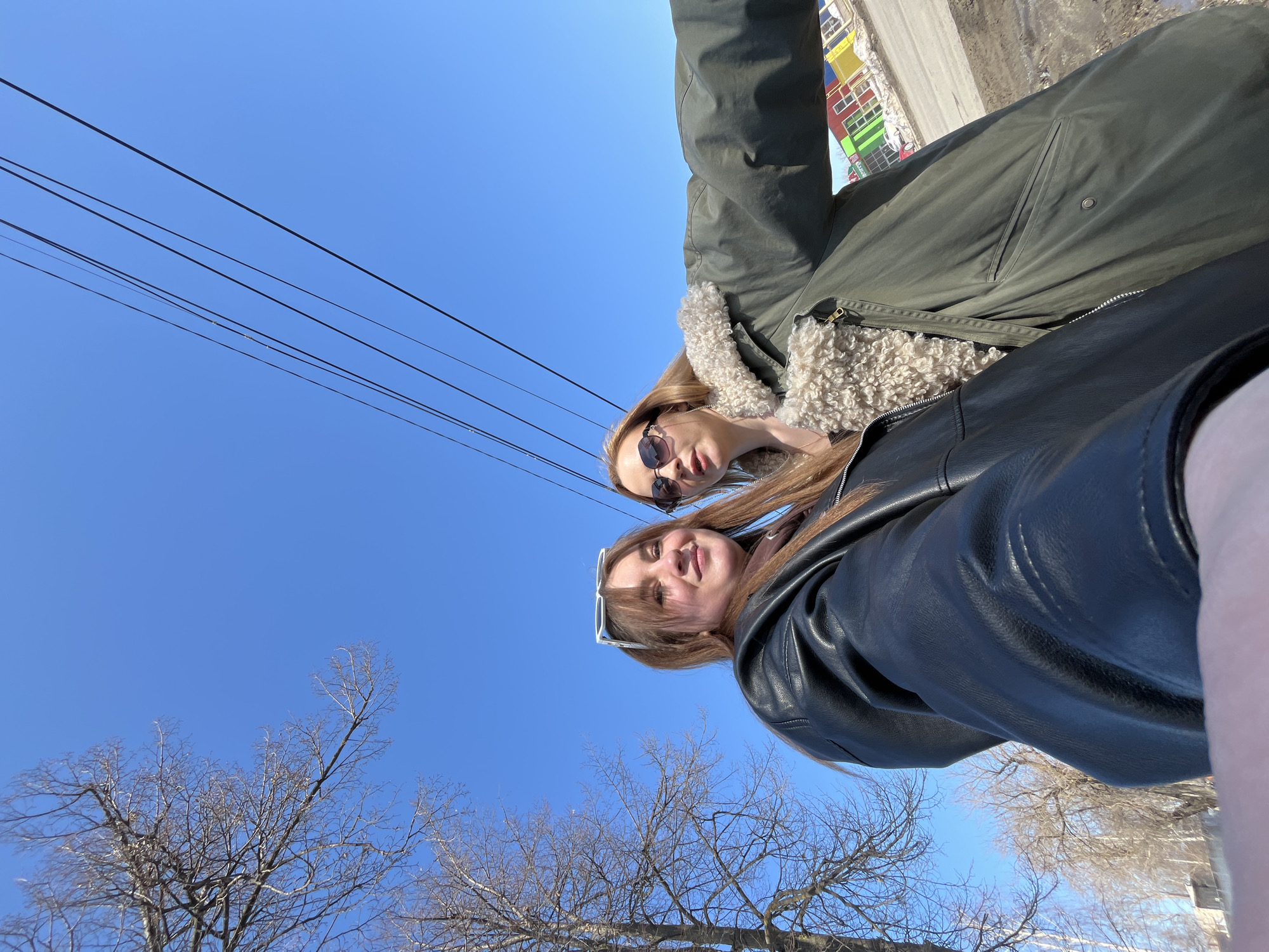 Two young women are positioned closely together, looking down at the camera, likely taking a selfie. The woman in the foreground wears a black leather jacket and has long reddish-brown hair with bangs. She also has sunglasses perched on top of her head. The woman behind her wears a green jacket with a white fleece collar and sunglasses. Overhead are power lines against a bright blue sky. In the background, bare tree branches are visible. Further in the background, a building with multi-colored panels can be seen. The location is identifiable as Chaikovsky, Russia, as evidenced by the distinctive architecture of the building in the background and the presence of Russian power lines.