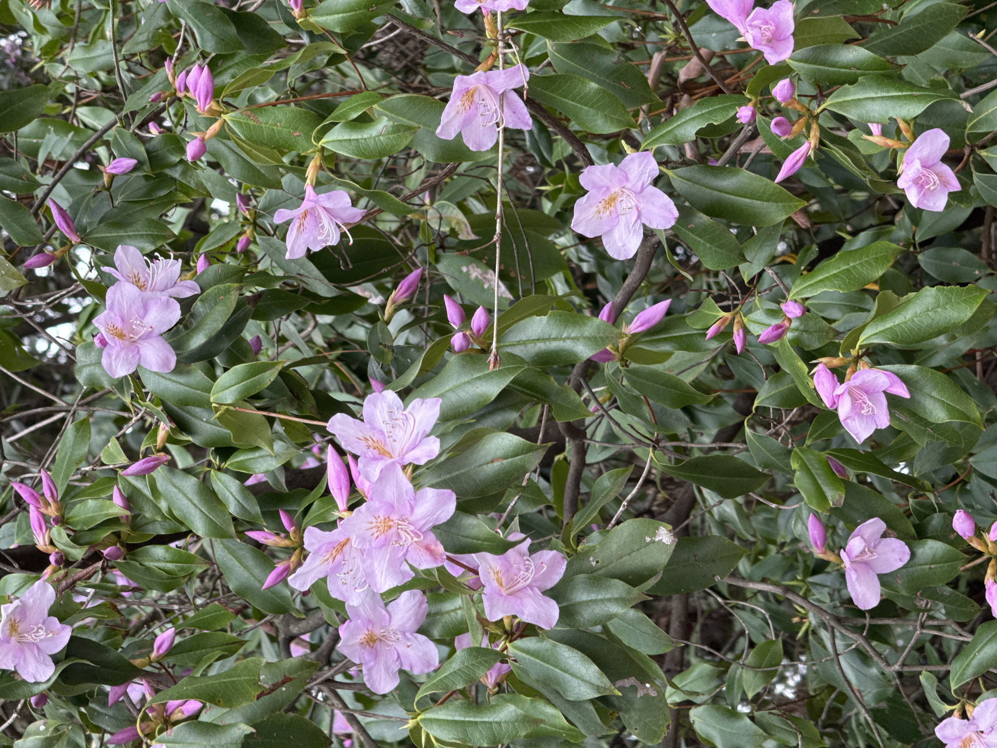 The image displays a close-up, vertical view of a flowering shrub located in Luoguta, China. The scene is dominated by numerous light purple-pink flowers and dark pink buds, densely interspersed among dark green, ovate leaves. Each open flower typically consists of five petals, revealing visible white stamens and pistils, with some upper petals exhibiting subtle orange or brown striations. The flower buds are elongated and appear in various stages of development, from tightly closed to partially open. The leaves are smooth, displaying a slight sheen, and some exhibit minor light-colored spots or imperfections on their surface. Background elements consist of blurred dark green foliage and thin, dark brown branches, indicating a dense plant growth within an outdoor botanical environment. No individuals, animals, or man-made objects are present.
