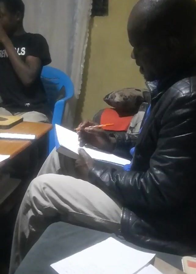 Two individuals are seated in a dimly lit room. The person in the foreground is wearing a black leather jacket and light-colored pants. They are focused on reading or writing in a notebook. A pen is in their hand. Several papers are scattered on the table in front of them. In the background, another person is seated in a blue chair at a small table. They are wearing a dark t-shirt and appear to be either thinking or talking on the phone. The room has painted yellow walls and a window with a white curtain.