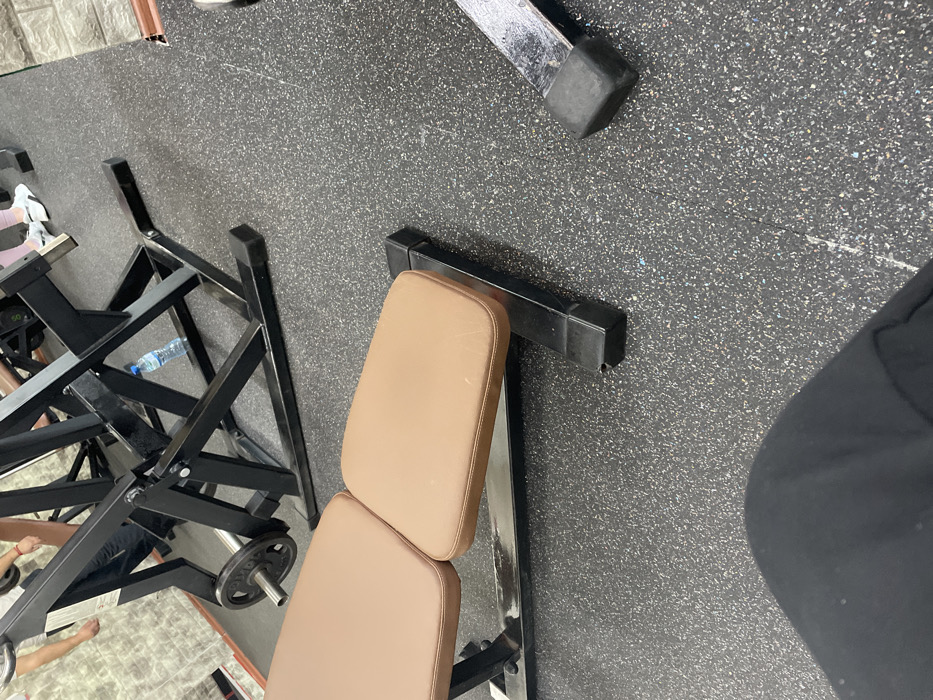 The scene depicts the interior of a gymnasium located in Cherven Bryag, Bulgaria. The floor is covered with dark, speckled rubber athletic flooring. In the immediate foreground, the upper thighs of a person wearing black athletic pants are visible, indicating the viewer's perspective is from a seated position. A two-segment, adjustable exercise bench with tan upholstered pads and a black metal frame is positioned centrally in the midground. Behind the bench, a large black metal resistance training machine, likely a leg press, is visible, with a black weight plate affixed to its loading pin. A clear plastic water bottle with a blue cap is on the floor beneath the frame of this machine. In the background, partial views of other gym equipment, including chrome and black frames, are discernible. Human legs and feet are visible in the background; one individual wears white sneakers with pink accents, and another appears to be barefoot or in dark socks near a textured, light-colored wall with a faux-stone pattern on the left. No explicit actions or interactions are captured beyond the presence of individuals and equipment in a gym setting.