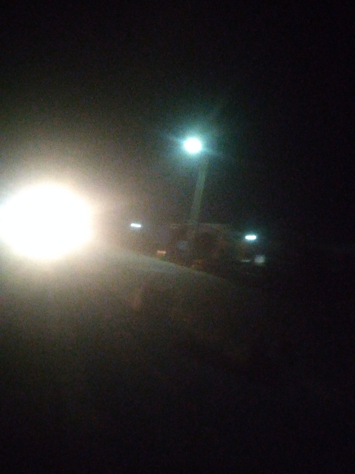 A dark night scene features a road lit by a bright headlight on the left. A street lamp illuminates the middle distance, revealing a building or structure. The image is grainy and visibility is low. The light sources create contrasting bright spots against the deep darkness, obscuring the details of the surroundings.