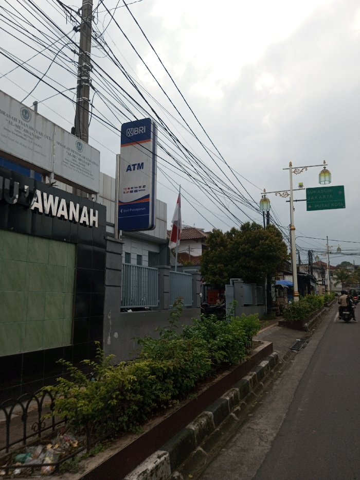The image depicts a street scene in Indonesia, with a BRI ATM sign prominently displayed next to a building named "AWANAH," possibly a school, given the text "MADRASAH TSANAWIYAH" and "SEKOLAH MENENGAH" visible on the sign. Overhead, a tangled mess of power lines obscures the sky. A street sign points towards Sukabumi, Jakarta, and Pusat Kota. A scooter passes by on the road, lined with a planted median. The Indonesian flag is seen.
