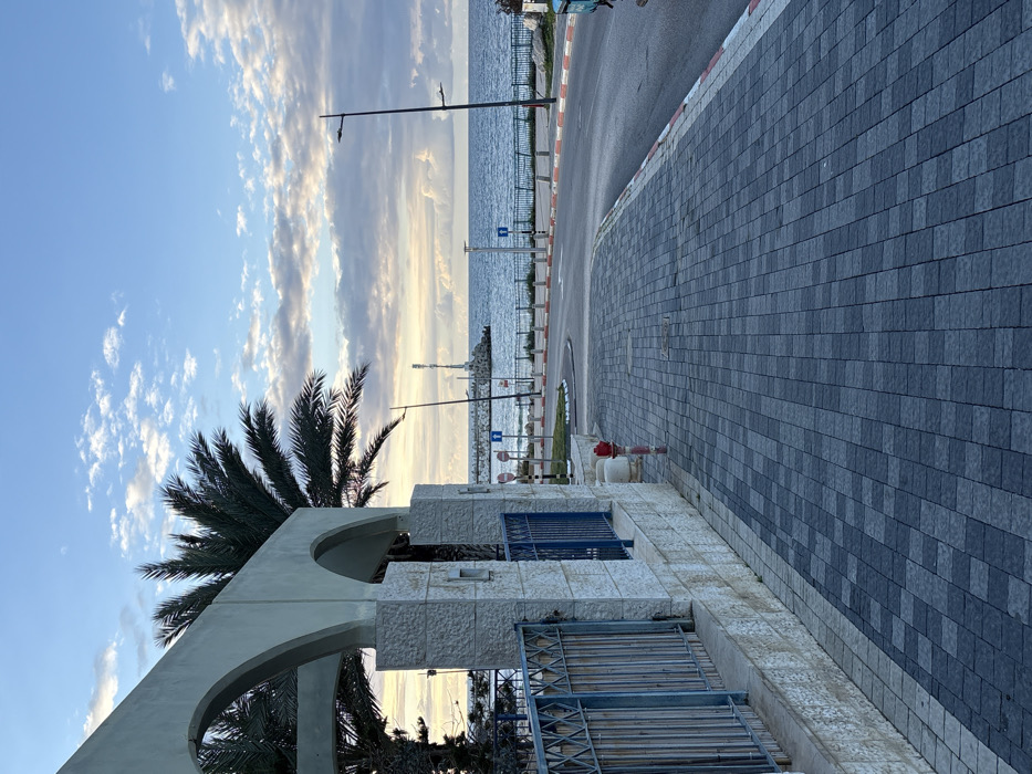 A tranquil seaside scene unfolds beneath a sky dappled with clouds and bathed in golden light. A palm tree and stone structure frame the left side of the image, while a paved walkway stretches along the coastline, bordering a road. The sea extends to the horizon, dotted with distant markers. A fire hydrant stands near the walkway.