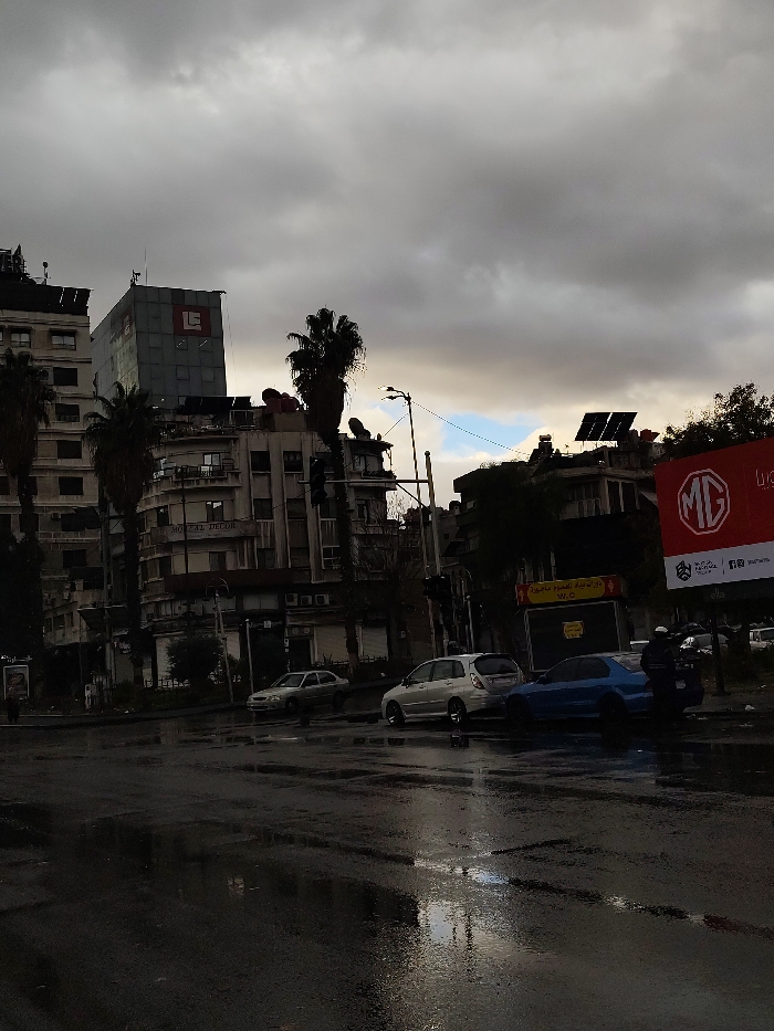 The image displays an urban street scene within As-Salihiya Municipality, Syria, under a predominantly overcast sky with heavy grey clouds, though a small patch of blue sky is visible towards the right horizon. The asphalt road surface is wet, reflecting ambient light and indicating the presence of puddles or recent precipitation. On the left, a multi-story building with balconies is partially visible. Adjacent to it, a taller, square-shaped building presents a prominent red "LE" logo on its upper facade. To the right of these structures, another multi-story building features the text "MOTEL DECOR" on one of its lower levels and is topped with multiple satellite dishes. Several dark-leaved palm trees are interspersed among the buildings. In the mid-ground, a tall street light pole with multiple fixtures and a traffic light are visible. On the right side of the wet road, several vehicles are present: a light-colored sedan, followed by a silver hatchback, and then a blue sedan, parked with its rear towards the viewer. A lone individual, dressed in dark clothing, stands near the rear of the blue sedan. Further right, a large red billboard prominently displays the white "MG" logo, accompanied by smaller Arabic text and social media icons. Below this billboard, a smaller yellow sign with Arabic text, including "W.C.", is discernible. Several rooftops in the background on the right side feature installed solar panels.