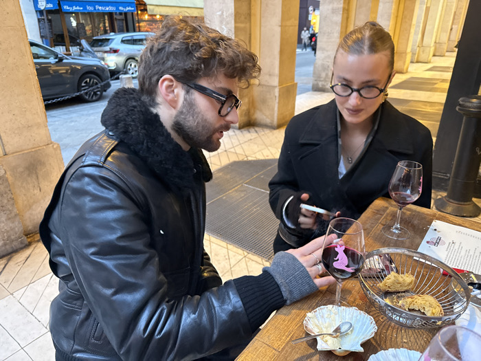 A man and a woman sit at a wooden table outdoors. The man wears a black leather jacket with a fur collar, glasses, and a dark sweater underneath. The woman wears a black coat and glasses and holds a cigarette. Two wine glasses filled with red wine sit on the table, one adorned with a pink cat sticker. A silver basket contains partially eaten food. An empty scallop shell with a spoon sits next to the man's hand. A menu lies on the table. In the background, a street scene unfolds, with cars and pedestrians visible.