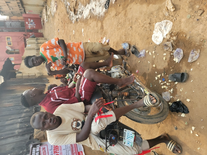 Three young men are sitting on a parked motorcycle in an outdoor setting. The man in front wears a beige shirt and shorts and sandals. The middle man wears a maroon shirt and shorts, and the man at the back is wearing an orange shirt and beige shorts. Several pairs of sandals are scattered around the motorcycle. The ground is littered with trash. A building is visible in the background. The motorcycle has a license plate that reads "UMA 752 QS."