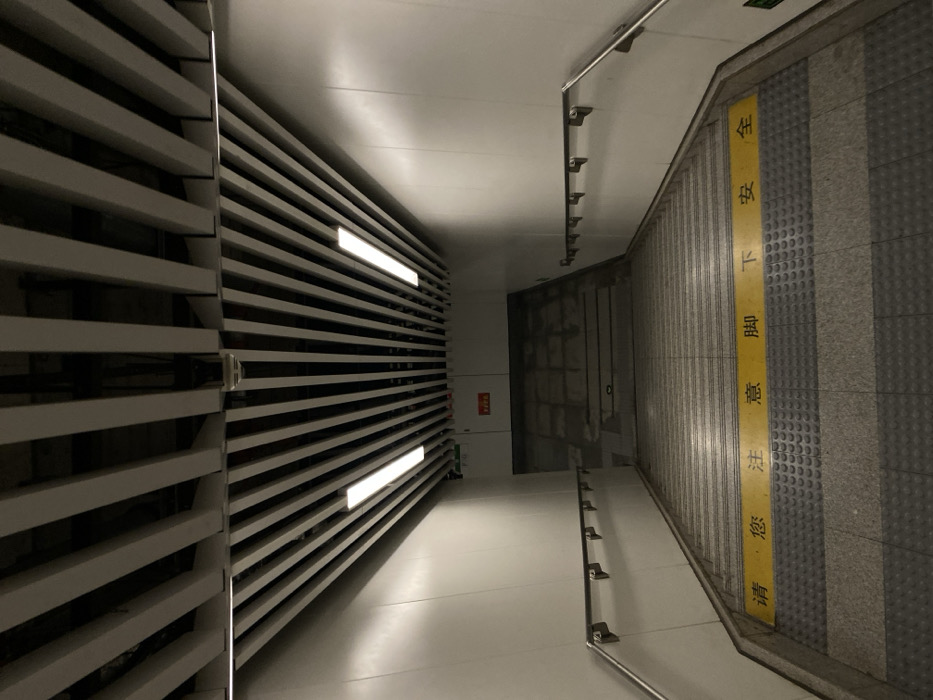 A narrow, well-lit staircase descends, bordered on one side by a grey, textured wall with a yellow stripe displaying vertical text in a non-English script