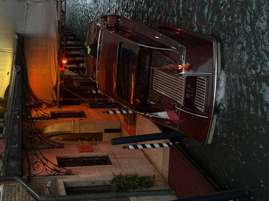 A boat, labeled “MOA NYC,” is navigating a narrow canal bordered by a building with ornate wrought-iron details and scaffolding. The boat is brown with a wooden deck. The building is illuminated with warm light, showcasing windows and a small bush at its base. The canal is dark, and the boat's movement creates white ripples in the water. Black and white striped bollards are fixed to the building's edge, and an Italian flag is attached to the boat.