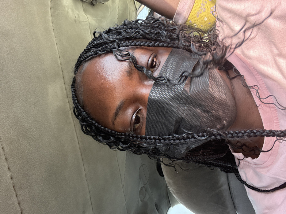 An individual with dark skin and braided hair is depicted in a close-up, chest-up view, appearing to be inside a vehicle in the city of New Nyanya, Nigeria. The person is wearing a light pink crew-neck t-shirt and a black disposable-style face mask that covers the nose and mouth. White eyeliner is visible on the lower lash line of both eyes. The hair is styled in dark braids, with some wavy, loose strands framing the face and extending over the shoulders. The individual's gaze is directed forward, towards the camera. The vehicle's interior ceiling, upholstered in a light beige or grey textured fabric, is visible in the upper portion of the frame. A dark, possibly grey, seat back is partially visible behind the individual on the left, and a segment of yellow patterned fabric is visible on the right side of the frame, adjacent to the individual's shoulder.
