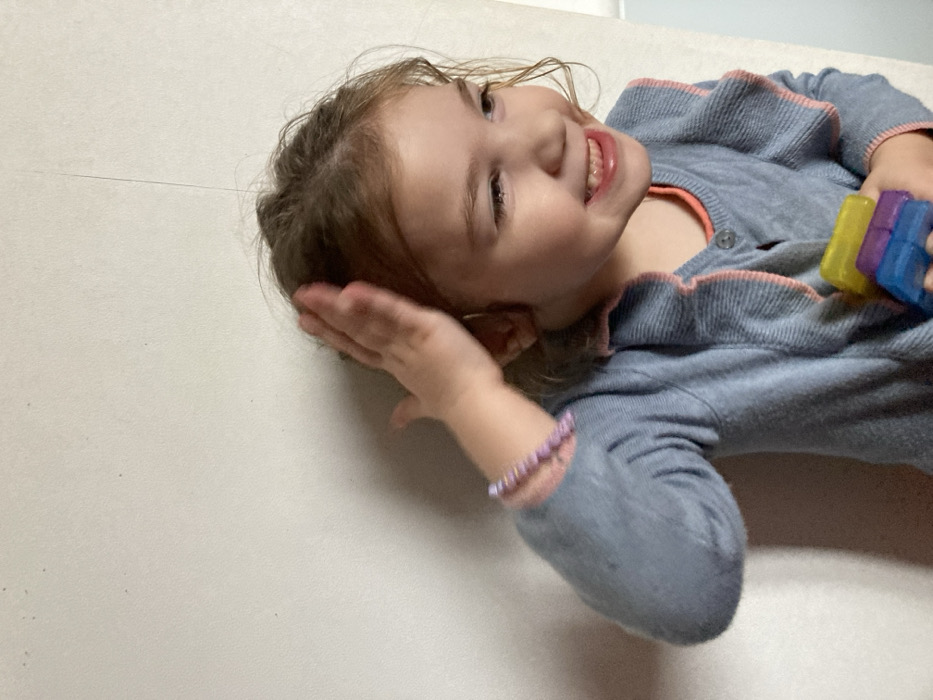 The image depicts a young child, appearing female, in a close-up, waist-up shot against a plain, light-colored wall
