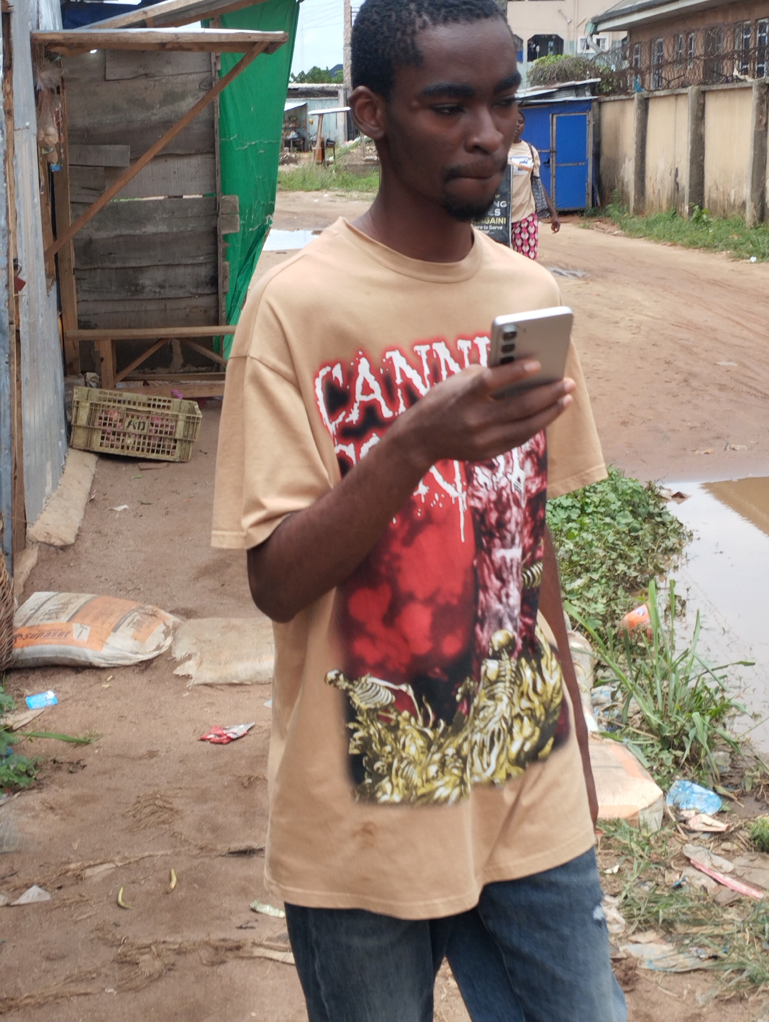 In Ihiagwa, Nigeria, a young man stands on a dirt road alongside a shack-like structure with a green tarp. The road has puddles of water and is littered with trash and vegetation. The man is wearing a tan T-shirt with a graphic print and blue jeans. He holds a silver smartphone in his hand, looking down at it. Another person is visible in the background walking away from the viewer on the right side of the frame, with a building and wall further in the distance.