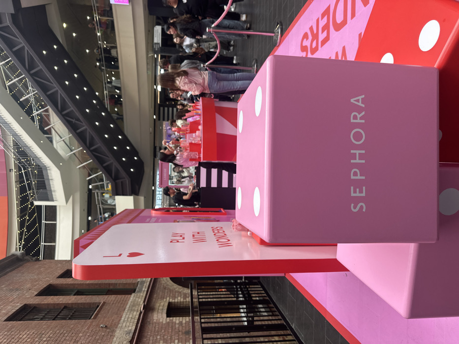 A brightly lit interior space with a Sephora display featuring oversized pink dice