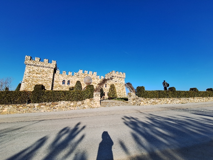 An exterior long shot depicts a stone-built structure resembling a castle, situated in Arbanassi, Bulgaria, under a clear blue sky. The edifice features crenellated battlements along its roofline and a prominent square tower on the left side. The construction consists of irregular light-brown quarried stone blocks. A low stone wall forms a perimeter in front of the building, topped by a neatly trimmed dark green hedge. Within the hedge line, an arched stone entrance with dark, leafless climbing vines is visible towards the center, and a large, spherical, light-colored decorative orb is positioned to the right of the tower. Further to the right, a dark, human-like statue, possibly a knight holding a shield, stands above the hedge. The foreground consists of an asphalt-paved surface across which numerous elongated, dark shadows are cast from the left. A distinct, human-shaped shadow is visible in the lower center-right foreground, suggesting the photographer's position. The scene is illuminated by direct sunlight from the left, indicated by the sharp shadows. No individuals are directly visible.
