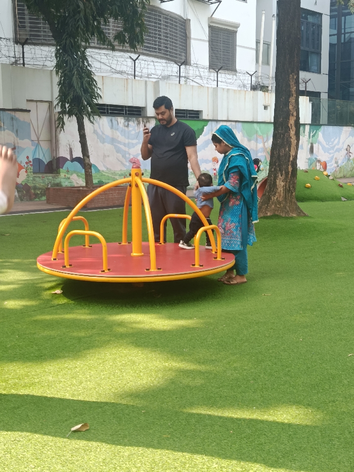A playground scene captures a family: a man on his phone, a woman in a turquoise hijab, and a child near a red and yellow merry-go-round. The playground features green artificial turf and a backdrop of a building with murals and security fencing. A tall tree stands to the right, and a glimpse of a foot is visible in the image's periphery.