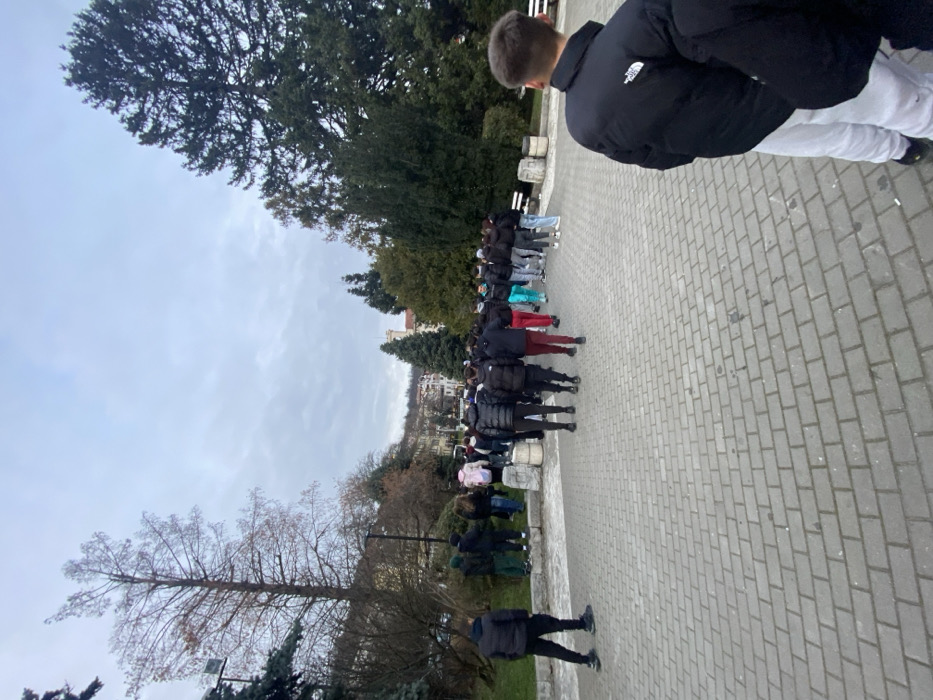 The image captures an outdoor urban scene in Veliko Tarnovo, Bulgaria, on an overcast day. The foreground consists of a paved surface made of gray rectangular pavers. On the immediate right, the back of a male individual wearing a black puffer jacket with a white logo (identified as "The North Face") and light gray sweatpants is visible, facing away from the camera. On the far left, a separate male individual in a black hoodie and dark pants stands, facing generally towards the right. In the midground, a group of approximately 30-40 individuals, mostly young adults or teenagers, are clustered and walking away from the camera's perspective, primarily towards the left side of the frame. They are dressed in various dark winter garments, including puffer jackets and hoodies; some individuals exhibit brighter clothing elements, such as red pants or a turquoise jacket. To the right of this group, two light-colored, cylindrical stone bollards or low pedestals are visible, with parts of park benches positioned behind them. The background features a sloped terrain covered with a mix of bare deciduous trees and dense evergreen trees, including tall conifers. Among the foliage, several light-colored buildings, some multi-storied with distinct architectural elements, including a prominent tower-like structure, are visible on a distant hillside. The sky is uniformly gray and overcast.